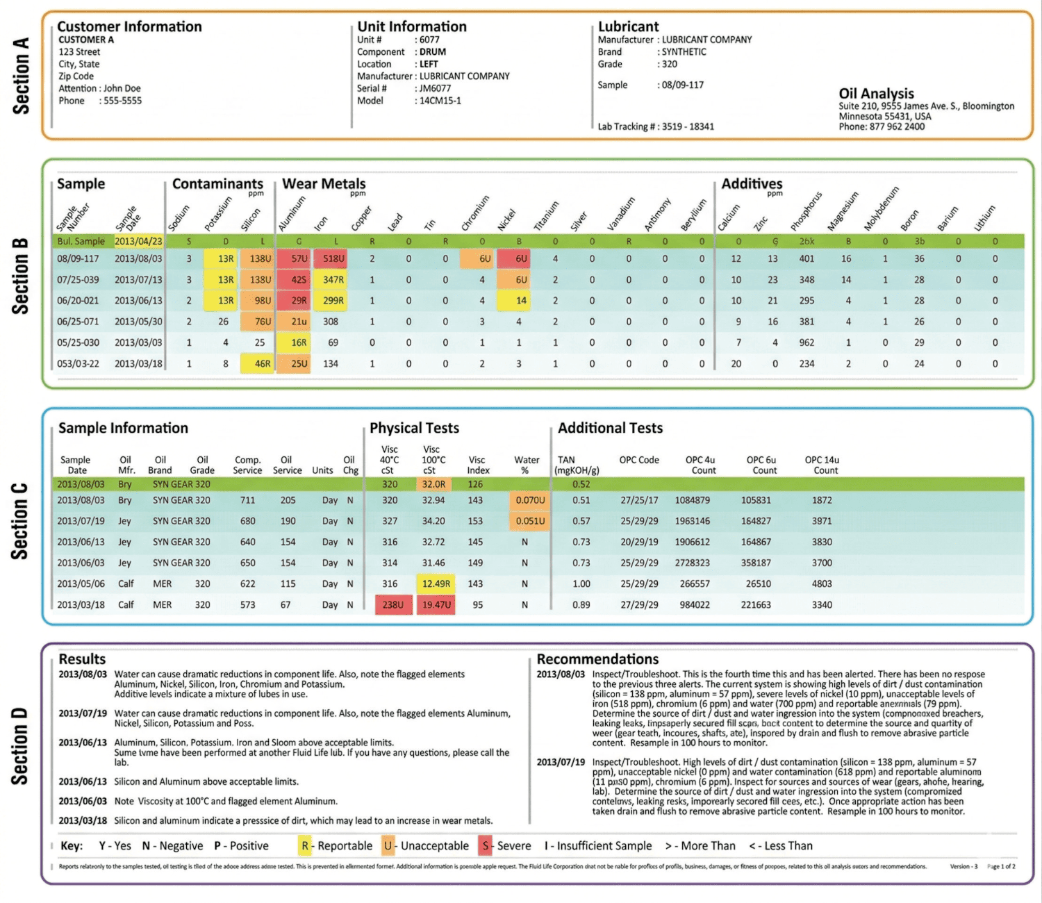 The first thing to check on an oil analysis report is the information about the customer, originating piece of equipment and lubricant (see Section A of the sample report below). Including these details is the customer's responsibility. Without this information, the effectiveness of the report will be diminished.