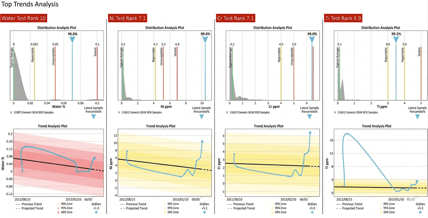 With a better understanding of the metallurgy within the system's components, any spikes in wear metals can be better associated, allowing a proper conclusion for which internal components are experiencing wear. Keep in mind that for trend analysis, it is important that samples are taken a tan appropriate and uninterrupted frequency.