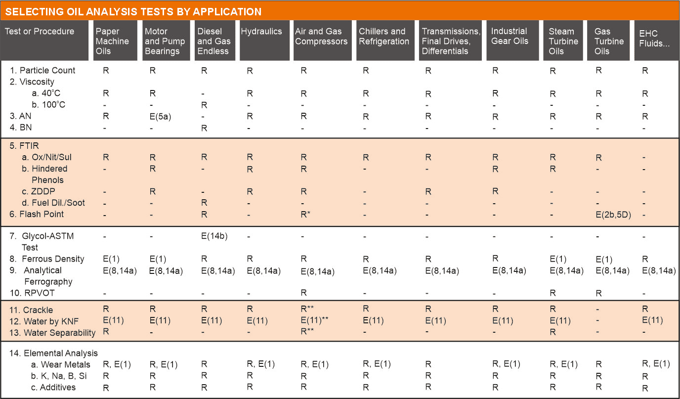 The table alongside shows how tests are used in each of the three main oil analysis categories.